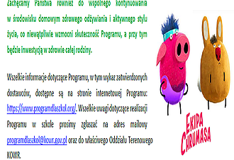 nasza szkoła bierze udział w edukacyjnym Programie dla szkół, dzięki któremu dzieci z klas I-V mogą w praktyce uczyć się zasad zdrowego odżywiania, poprzez regularne spożywanie owoców, warzyw i produktów mlecznych oraz powiązane działania edukacyjne. Zachęcamy również do kontynuowania aktywności związanych ze zdrową dietą oraz aktywnym stylem życia w domu rodzinnym.